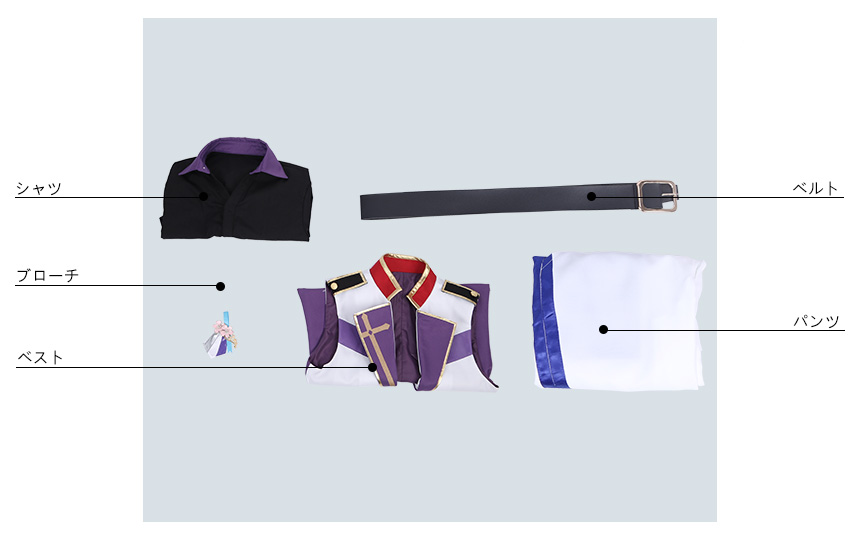 ベスト、シャツ、パンツ、飾り物(ブローチ、ベルト)