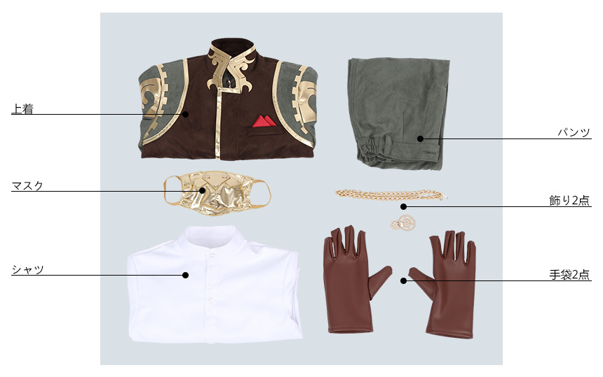 上着、シャツ、パンツ、飾り物(飾り2点、手袋2点、マスク)