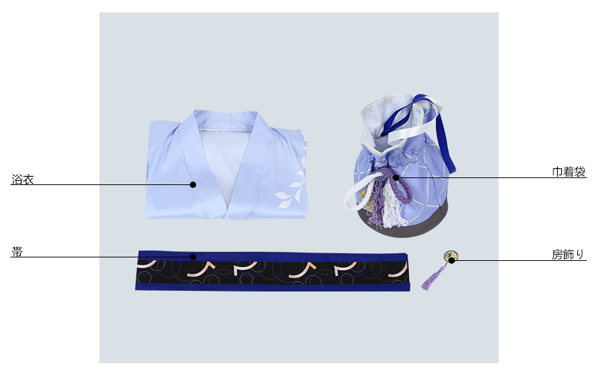 浴衣、飾り物(帯、房飾り、巾着袋)