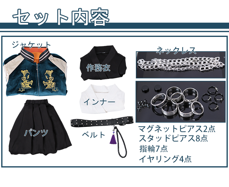 ジャケット、作務衣、インナー、パンツ、飾り物(ベルト、数珠チェーン、ネックレス、スタッドピアス8点、マグネットピアス2点、指輪7点、イヤリング4点)