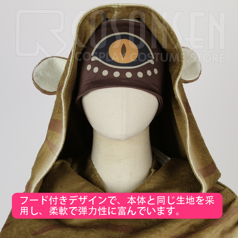 ポリウレタンで製作しました。フード付きデザインで、長衣と同じ模様がプリントされています。