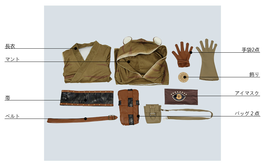 長衣、マント、飾り物(ベルト、帯、手袋2点、バッグ2点、アイマスク、飾り)