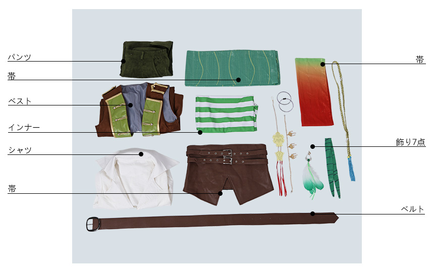 ベスト、パンツ、インナー、シャツ、飾り物(帯3点、ベルト、飾り 7点)