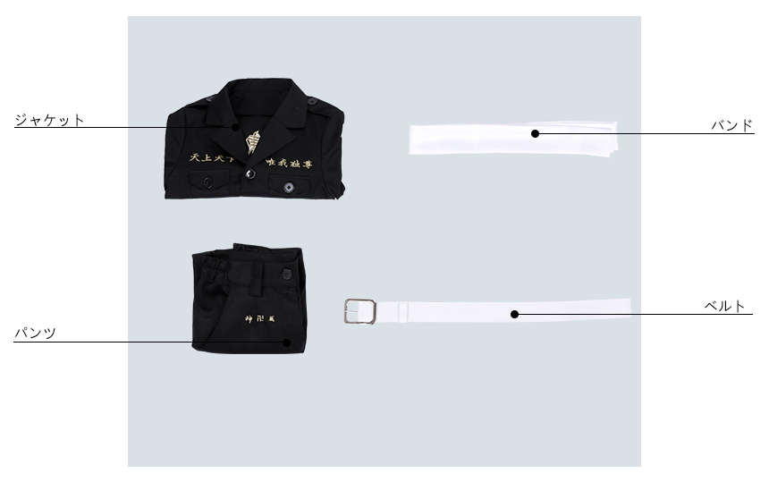 ジャケット、パンツ、飾り物(ベルト、バンド)