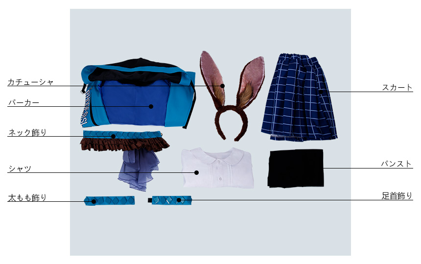 パーカー、シャツ、スカート、飾り物(ネック飾り、足首飾り、太もも飾り、パンスト、カチューシャ)