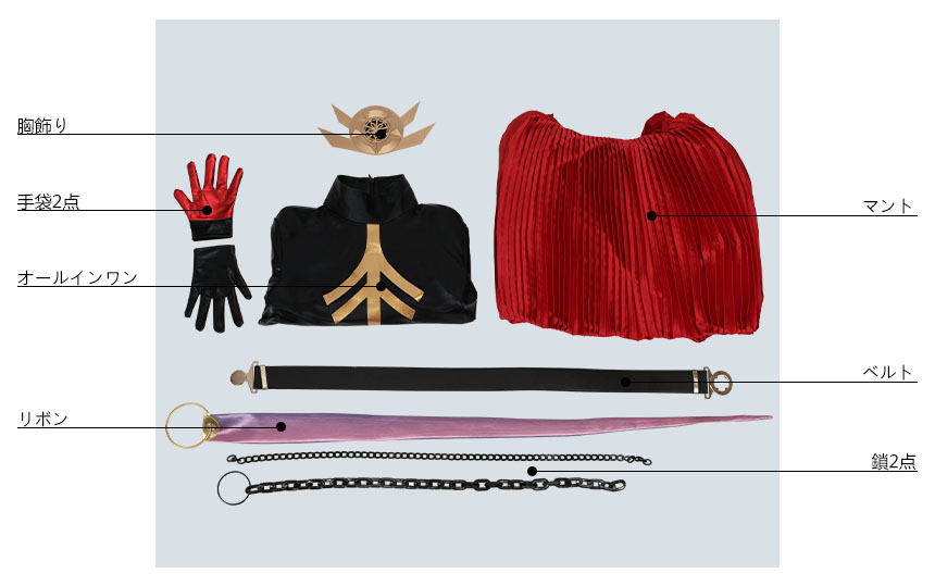 オールインワン、マント、飾り物(胸飾り、ベルト、リボン、鎖2点、手袋2点)