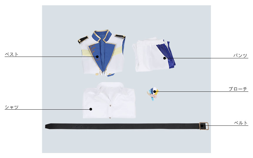 ベスト、シャツ、パンツ、飾り物(ブローチ、ベルト)