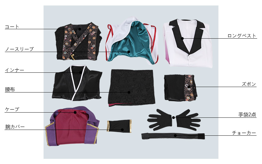 ケープ、ロングベスト、コート、ノースリーブ、インナー、腰布、ズボン、飾り物(手袋2点、チョーカー)