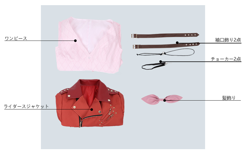 ワンピース、ライダースジャケット、飾り物(髪飾り、袖口飾り2点、チョーカー2点)