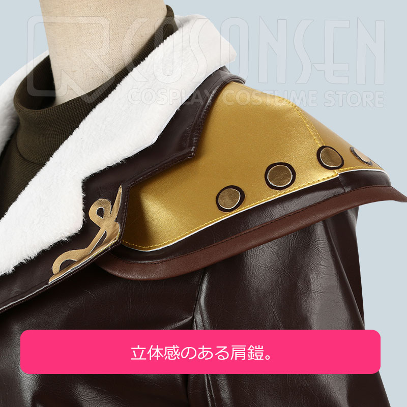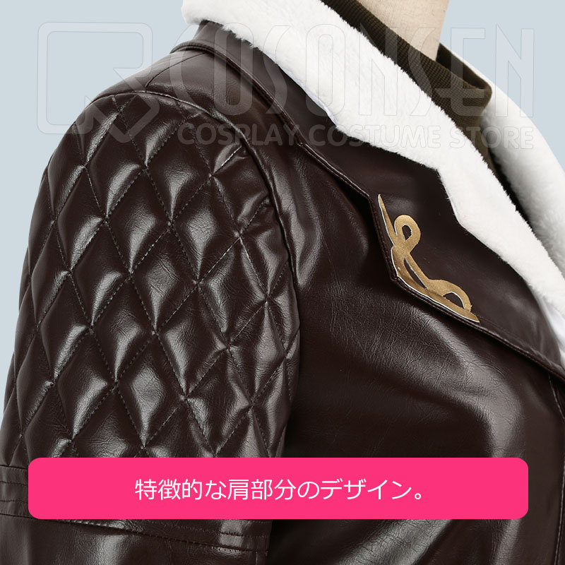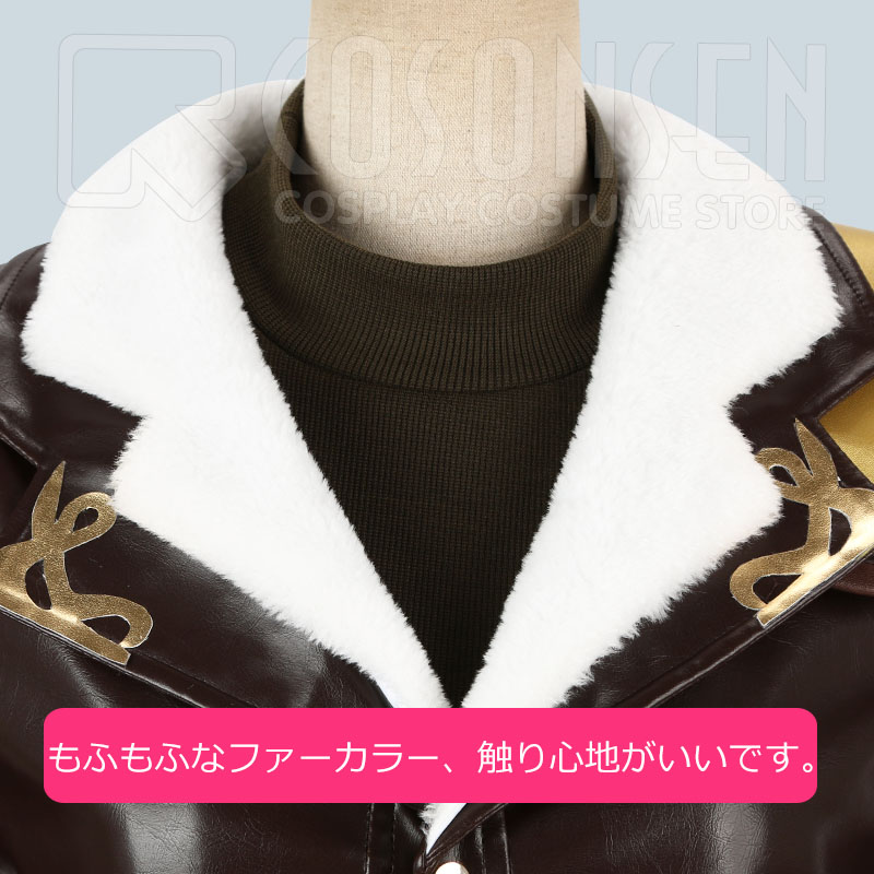 合皮で製作しました。襟の部分にもふもふな生地を採用しました。肩鎧をあしらって、高級感を与えています。
