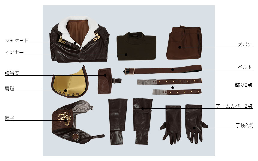 ジャケット、インナー、ズボン、飾り物(ベルト、飾り物2点、手袋2点、肩鎧、帽子、膝当て、アームカバー2点)