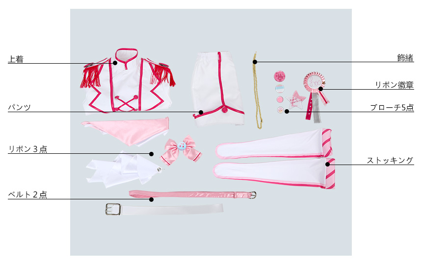 上着、パンツ、飾り物(リボン3点、飾緒、ベルト2点、ストッキング、リボン徽章、ブローチ5点)