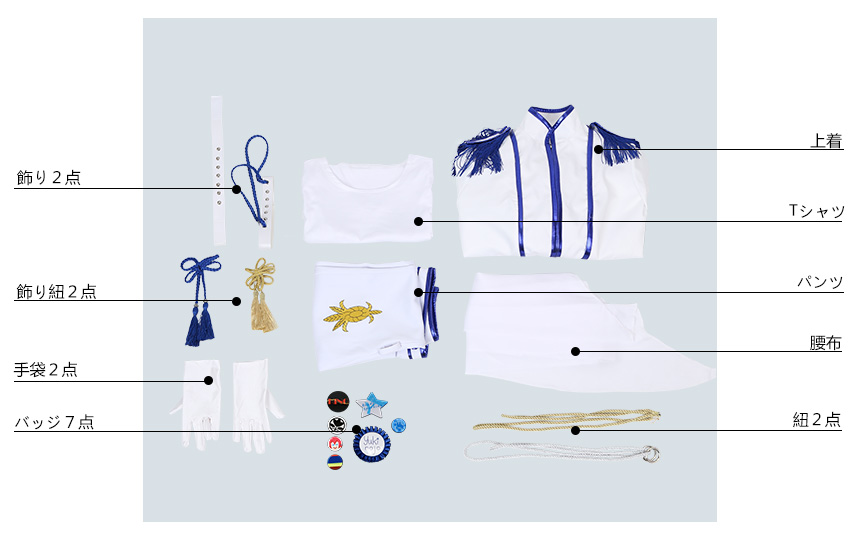 腰布、手袋2点、バッジ7点、飾り2点、紐2点、飾り紐2点も付属しています。