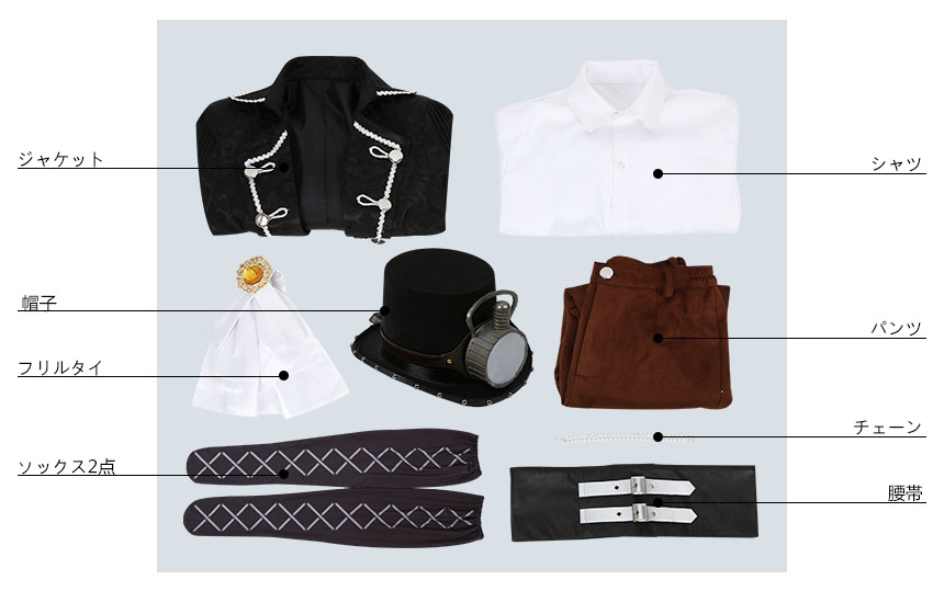 ジャケット、シャツ、パンツ、飾り物(腰帯、チェーン、フリルタイ、ソックス2点、帽子)