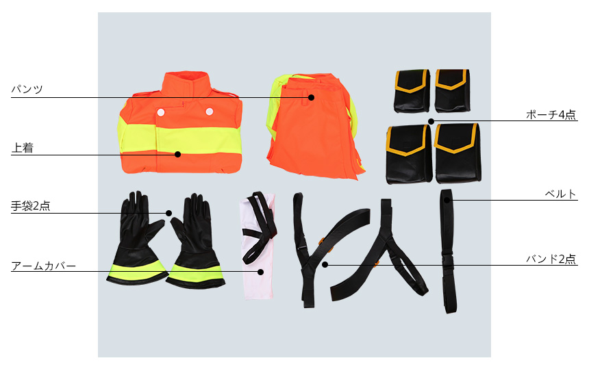 上着、パンツ、飾り物(アームカバー、ポーチ4点、手袋2点、バンド2点、ベルト)