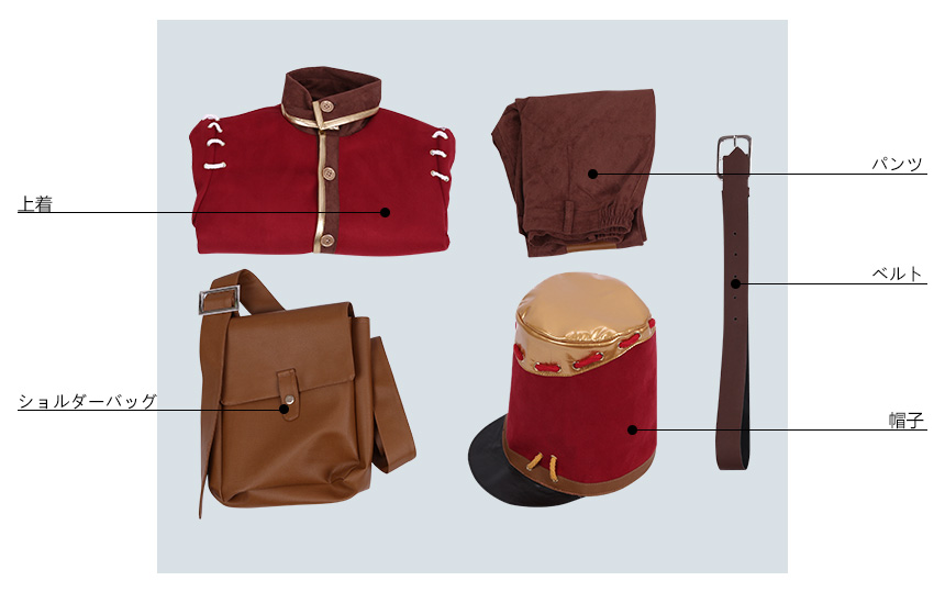 上着、パンツ、飾り物(ベルト、帽子、ショルダーバッグ)