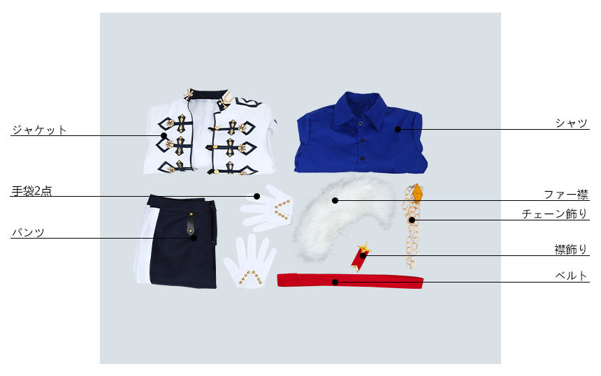ジャケット、シャツ、パンツ、飾り物(襟飾り、ファー襟、ベルト、チェーン飾り、手袋2点)