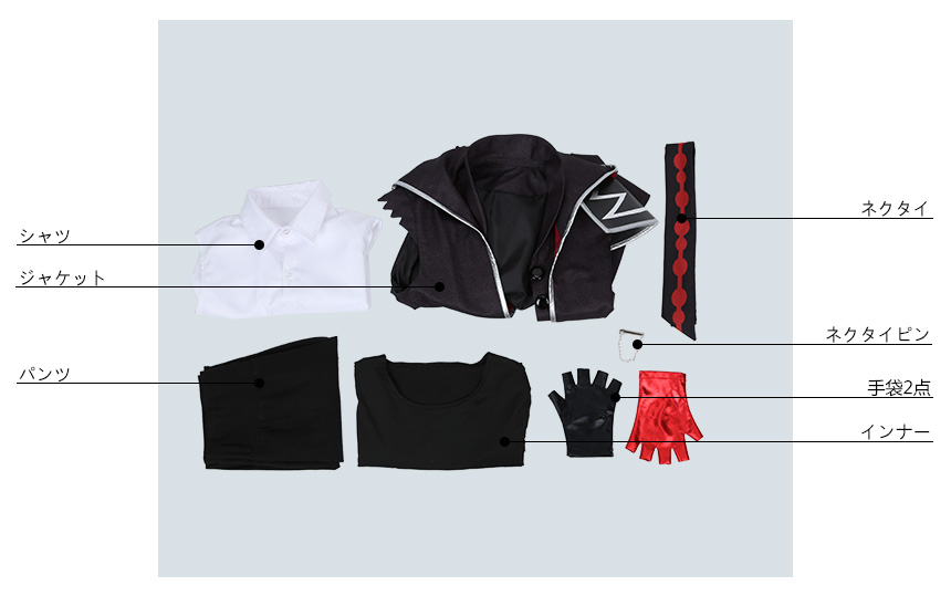 ジャケット、パンツ、インナー、シャツ、飾り物(手袋2点、ネクタイピン、ネクタイ)
