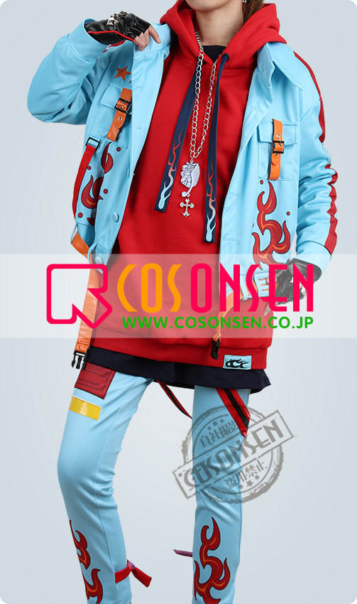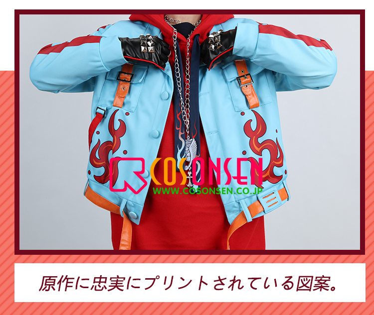 ジャージ生地で製作しました。フロントにボタンが付いています。炎の模様がプリントされています。全体はすっごくかっこいい感じを与えています。