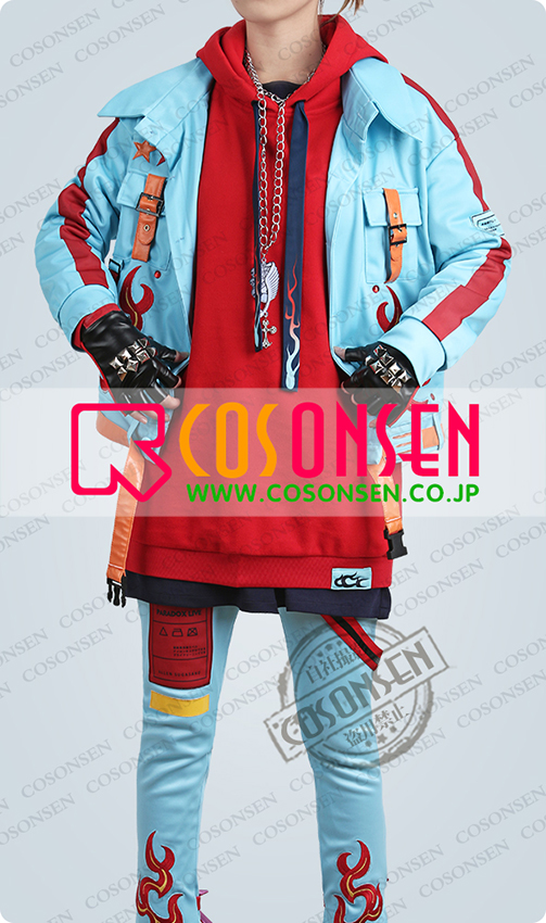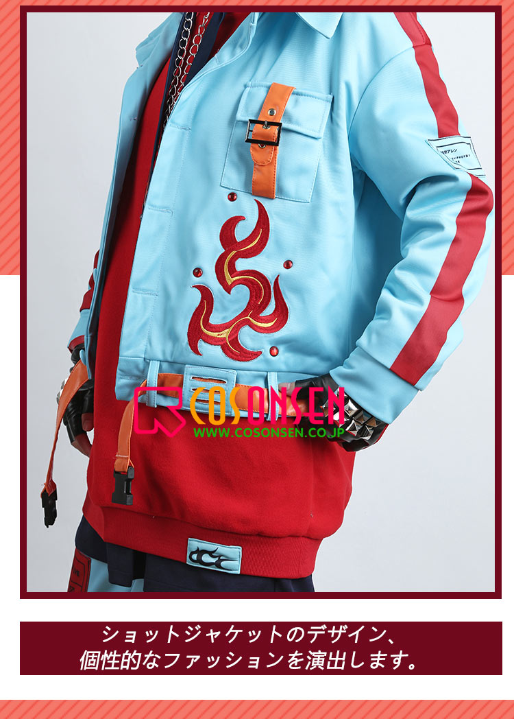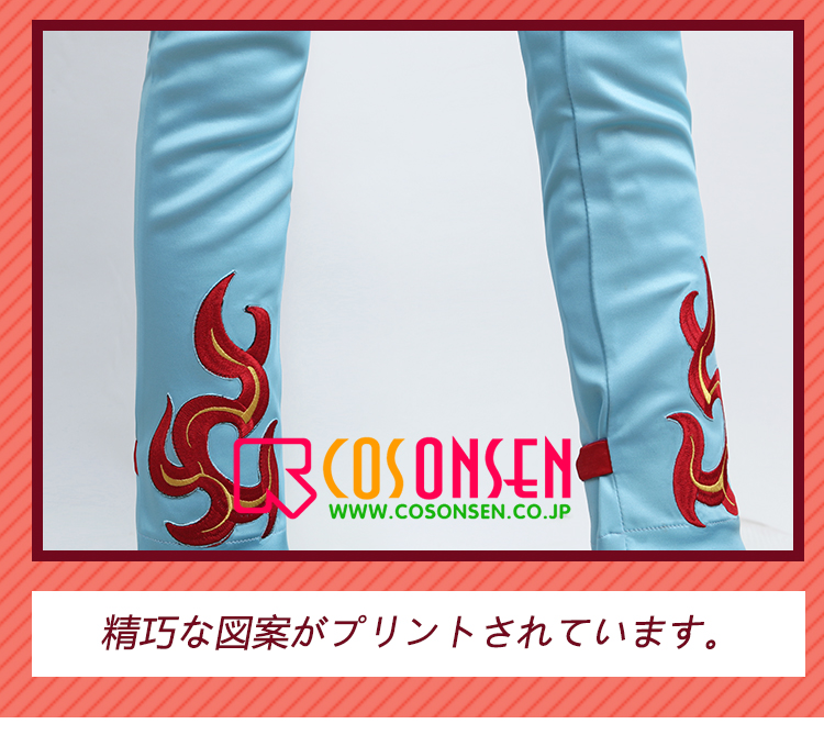 ジャージ生地で製作しました。フロントにボタンが付いています。炎の模様が刺繍されています。全体はすっごくかっこいい感じを与えています。