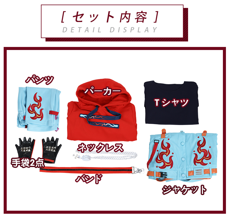 ジャケット、パーカー、Tシャツ、パンツ、飾り物(手袋2点、バンド、ネックレス)