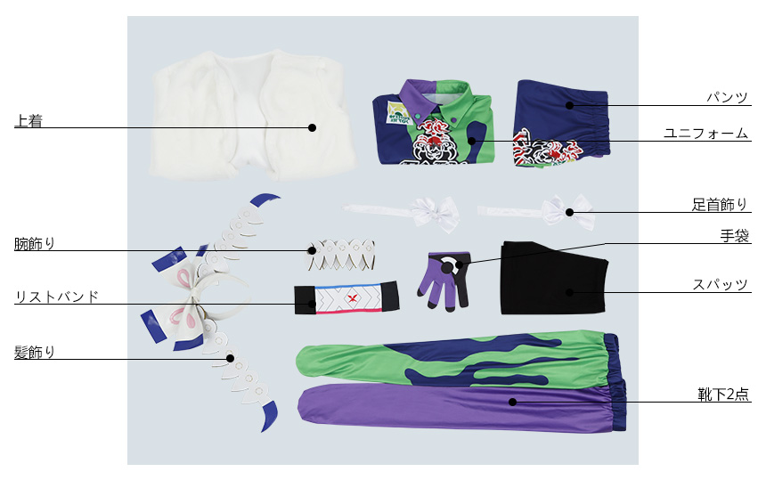 上着、ユニフォーム、パンツ、飾り物(スパッツ、靴下2点、髪飾り、足首飾り2点、手袋、リストバンド、腕飾り)