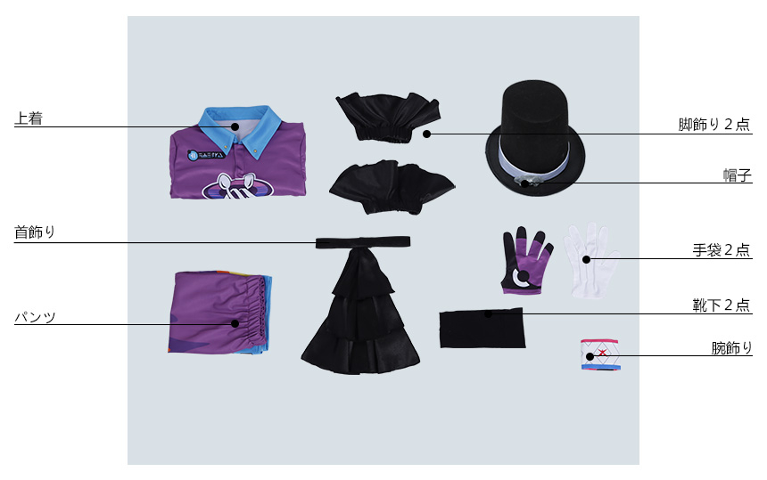 上着、パンツ、飾り物(帽子、首飾り、手袋2点、腕飾り、靴下2点、脚飾り2点)