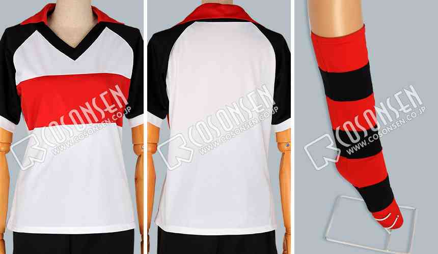 黒を基調したジャージ生地で製作します。通気性良いの運動服です。あと黒と赤を基調したしま模様のスボーツストッキングも付きます。
