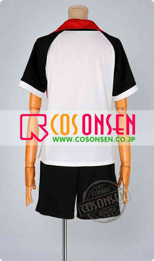 白と赤を基調したジャージ生地で製作します。折襟は赤です。袖は黒です。この衣装は天河原中専用のユニフォームです。
