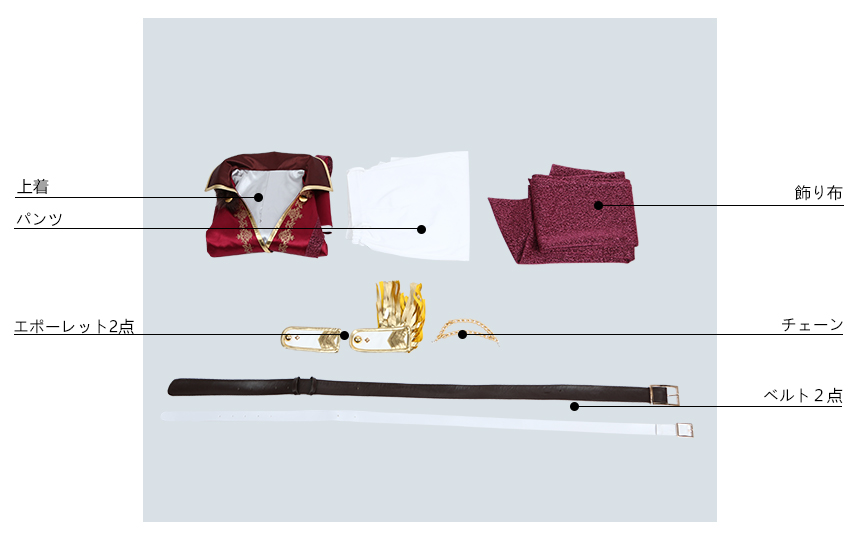 チェーン、エポーレット2点、飾り布、ベルト2点も付属しています。