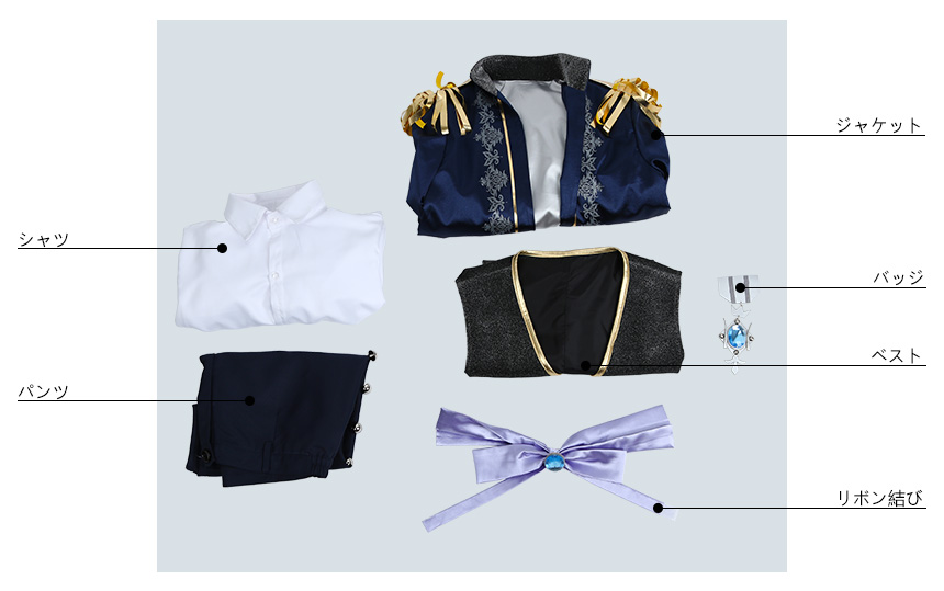ジャケット、ベスト、シャツ、パンツ、飾り物(リボン結び、バッジ)
