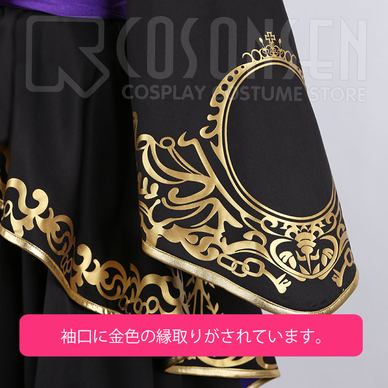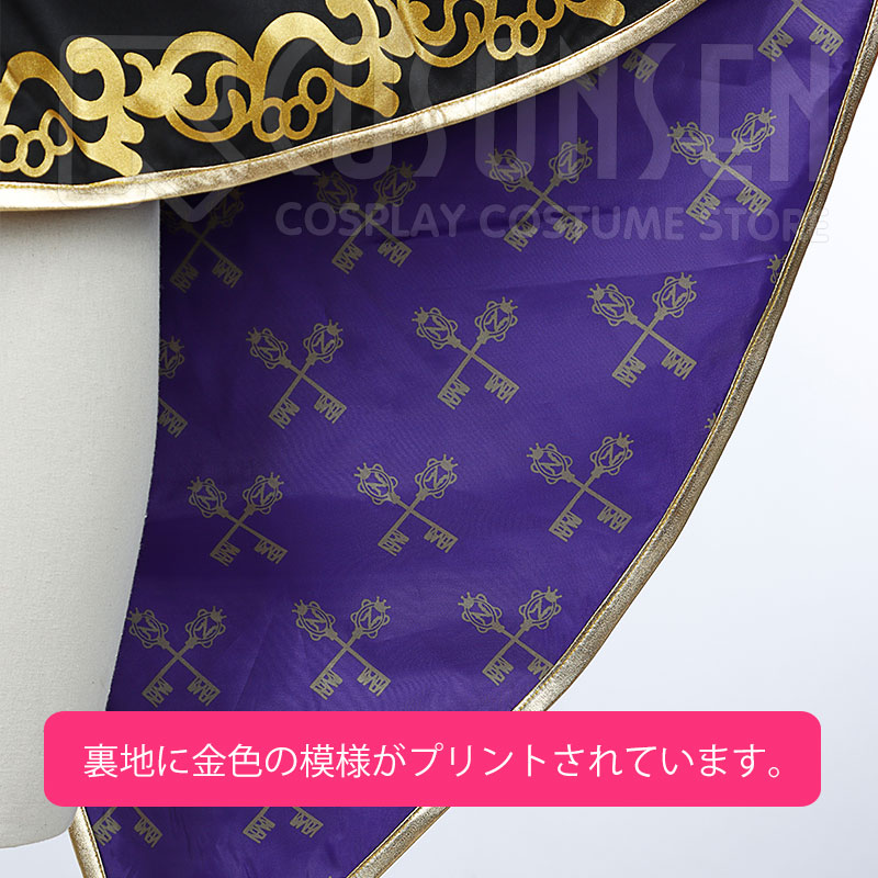 ポリエステルギャバで製作しております。柔らかな生地で手触りがとても良いです。裾と袖口に華麗な金色の柄がプリントされて、紫の裏地にクロスした鍵の柄もきちんとプリントされています。