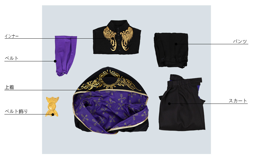 上着、インナー、パンツ、飾り物(ベルト、ベルト飾り、スカート)