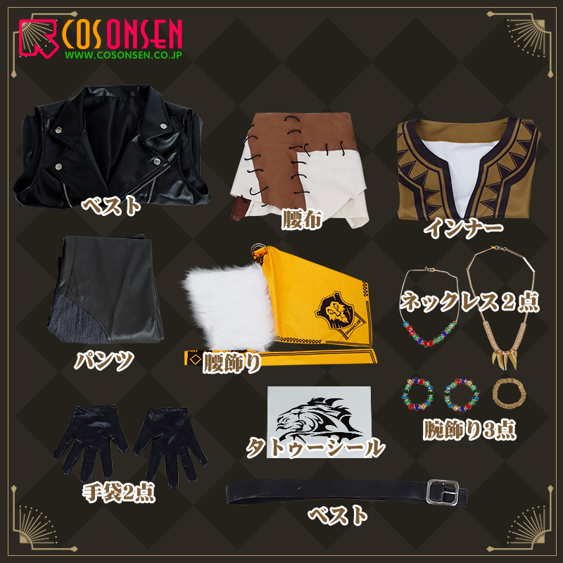 ベスト、ノースリーブ、パンツ、飾り物(ベルト、手袋2点、腰布、腰飾り2点、ブレスレット3点、ネックレス2点、タトゥーシール)