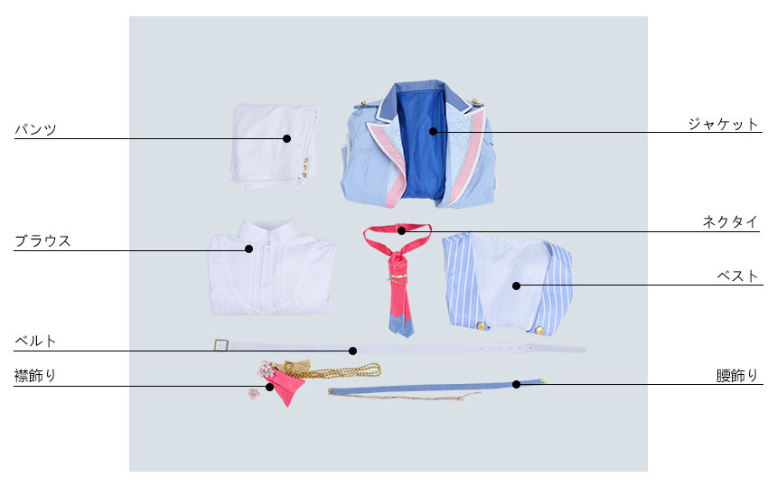 ジャケット、ブラウス、ベスト、パンツ、飾り物(ネクタイ、ベルト、襟飾り、腰飾り)