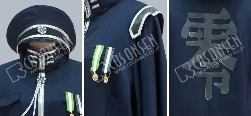 背中に「零」の文字が刺繍され、前に勲章とエポーレットが付いています。振袖のように大きな袖は特徴で、