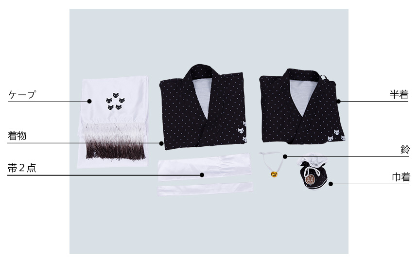 ケープ、帯2点、鈴、巾着も付属しています。