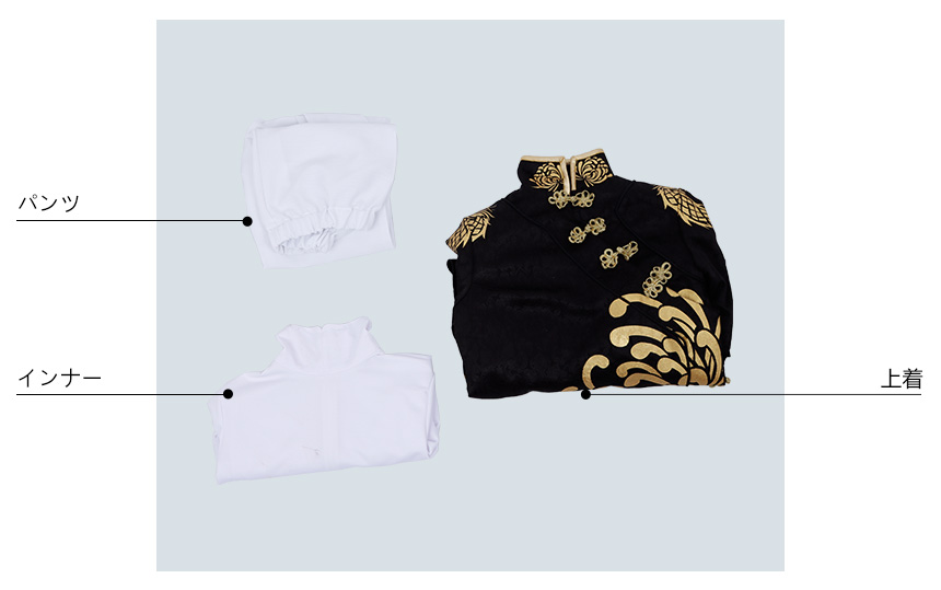ジャガード生地で製作しました。横に中国風のボタンで留めています。金色の模様がついています。