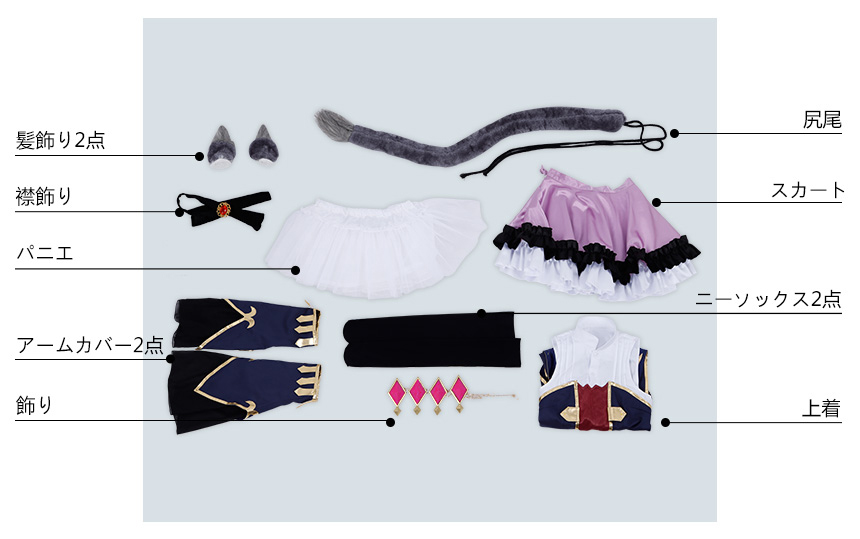 上着、スカート、飾り物(髪飾り2点、襟飾り、パニエ、アームカバー2点、尻尾、ニーソックス2点、腰飾り)