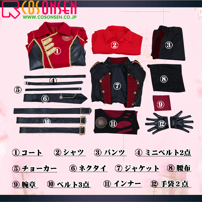 コート、ジャケット、シャツ、インナー、パンツ、飾り物(チョーカー、ネクタイ、ミニベルト2点、腕章、腰布、ベルト3点、手袋2点)