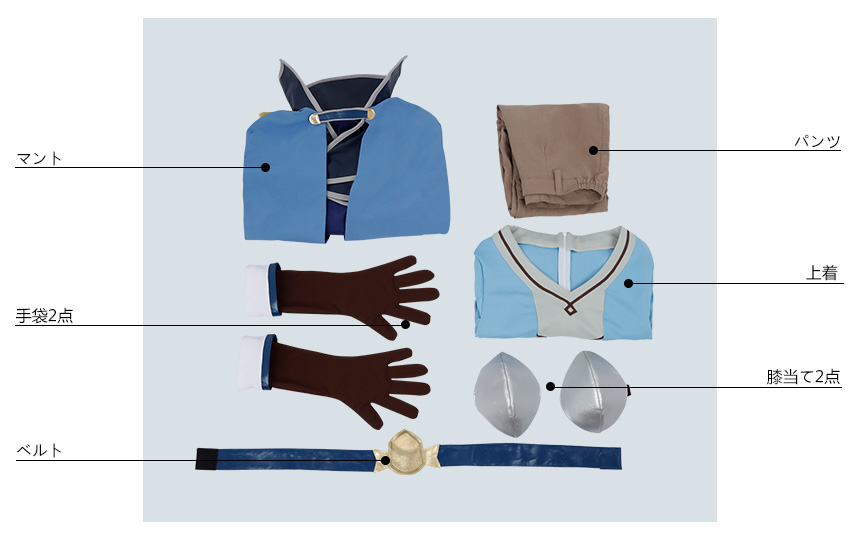 マント、上着、パンツ、飾り物(手袋2点、ベルト、膝当て2点)