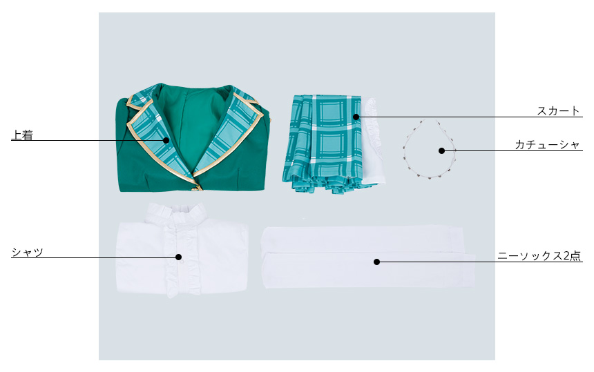 上着、シャツ、スカート、飾り物(カチューシャ、ニーソックス2点)