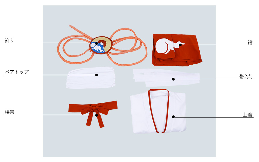 上着、べアトップ、袴、飾り物(腰帯、飾り、帯2点)