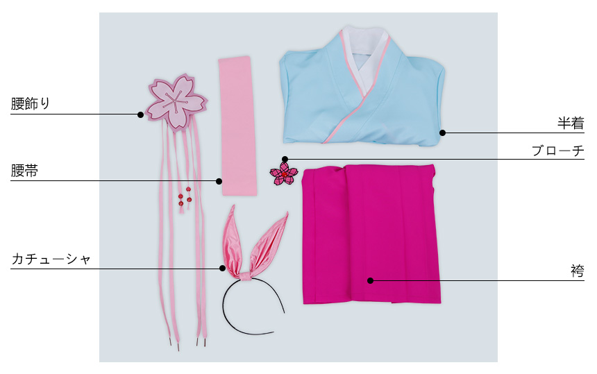 半着、袴、飾り物(腰飾り、腰帯、カチューシャ、ブローチ)