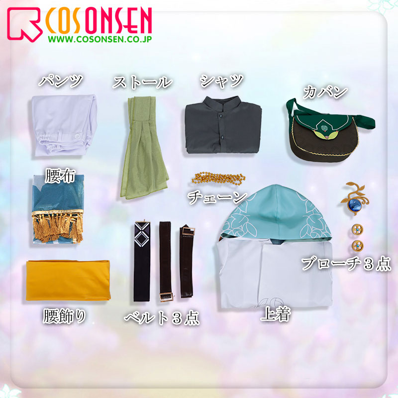 カバン、ストール、ブローチ3点、チェーン、ベルト3点、腰布、腰飾りも付属しています。