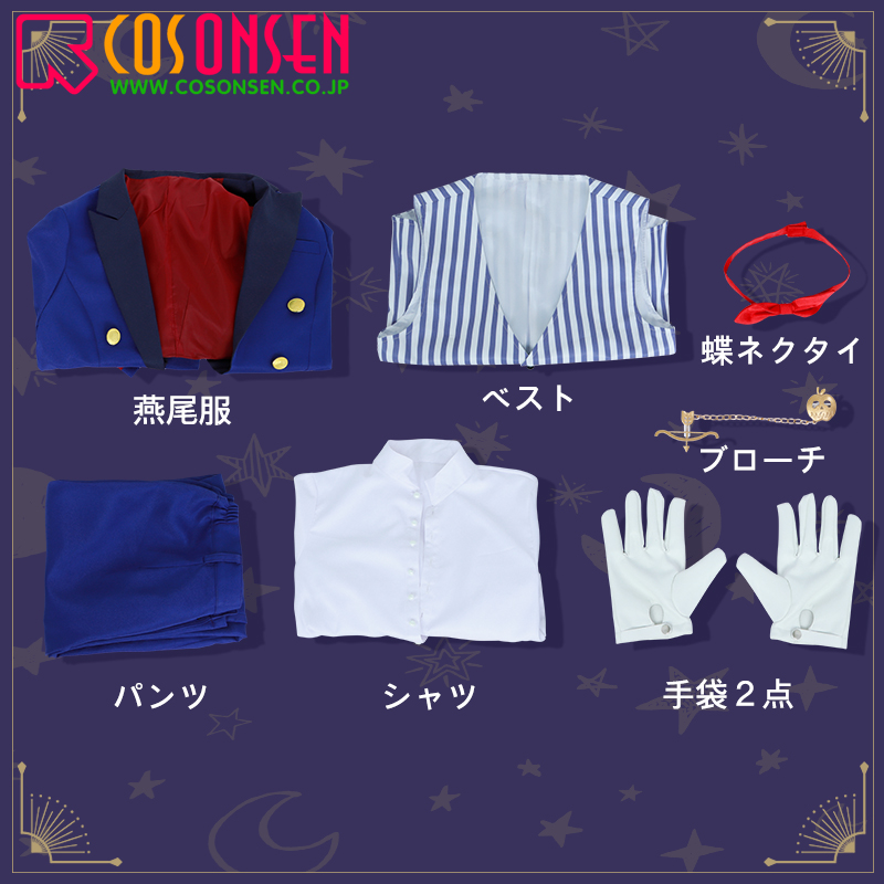 燕尾服、ベスト、シャツ、パンツ、飾り物(蝶ネクタイ、手袋2点)