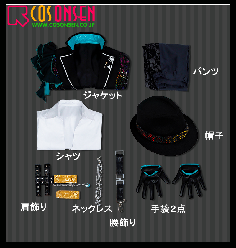 ジャケット、シャツ、パンツ、飾り物(帽子、手袋2点、肩飾り、ネックレス、腰飾り)