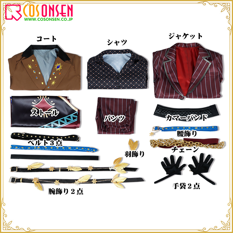 コート、ジャケット、シャツ、パンツ、飾り物(ストール、チェーン、羽飾り、カマーバンド、腰飾り、ベルト3点、腕飾り2点、手袋2点)