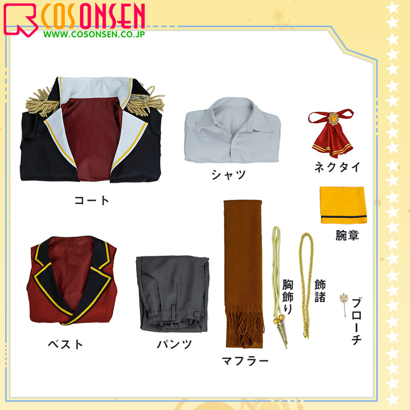 コート、ベスト、シャツ、パンツ、飾り物(マフラー、ネクタイ、胸飾り、ブローチ、腕章)