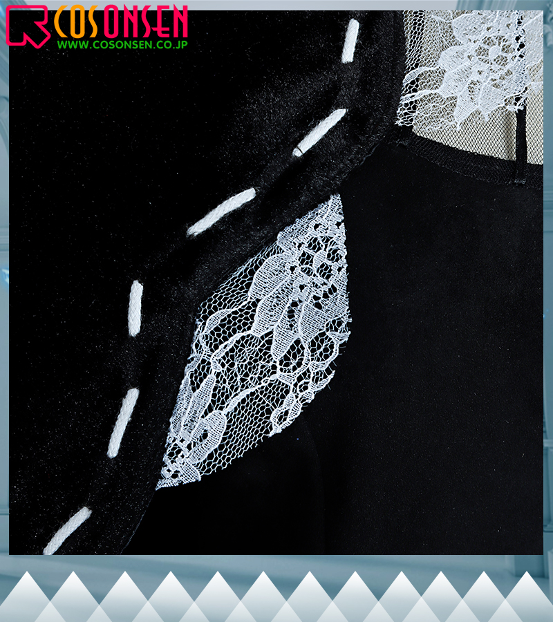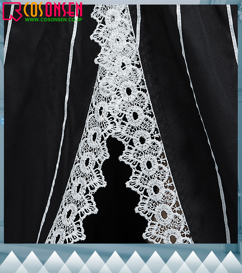 ポリエステルギャバで製作ています。長いデザインを使って、原作を忠実に再現しました。エッジにレースで飾っています。
